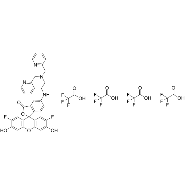 ZnAF-1F tetraTFA(1 μM)在 100 mM HEPES 缓冲液中的 Kon 值为 3.5*106 M-1s-1,Koff 值为 7.7*10-3 s-1[1]。ZnAF-1F tetraTFA 是一种在中性和微酸性条件下的 Zn 传感器[2]。
