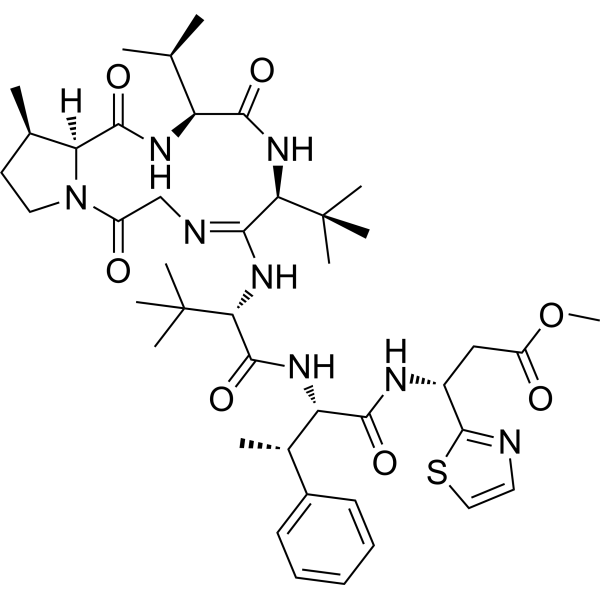 InChI=1S/C42H62N8O7S/c1-23(2)30-36(53)49-33(41(5,6)7)35(44-22-28(51)50-19-17-24(3)32(50)38(55)46-30)48-34(42(8,9)10)39(56)47-31(25(4)26-15-13-12-14-16-26)37(54)45-27(21-29(52)57-11)40-43-18-20-58-40/h12-16,18,20,23-25,27,30-34H,17,19,21-22H2,1-11H3,(H,44,48)(H,45,54)(H,46,55)(H,47,56)(H,49,53)/t24-,25+,27-,30+,31+,32+,33-,34-/m1/s1