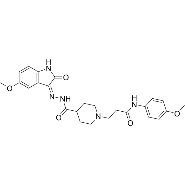 注射用配方1: DMSO : Tween 80: Saline = 10 : 5 : 85 (如: 100 μL DMSO → 50 μL Tween 80 → 850 μL Saline)(IP/IV/IM/SC等) *生理盐水/Saline的制备:将0.9g氯化钠/NaCl溶解在100 mL ddH ₂ O中,得到澄清溶液。 注射用配方 2: DMSO : PEG300 :Tween 80 : Saline = 10 : 40 : 5 : 45 (如: 100 μL DMSO → 400 μL PEG300 → 50 μL Tween 80 → 450 μL Saline) 注射用配方 3: DMSO : Corn oil = 10 : 90 (如: 100 μL DMSO → 900 μL Corn oil) 示例: 以注射用配方 3 (DMSO : Corn oil = 10 : 90) 为例说明, 如果要配制 1 mL 2.5 mg/mL的工作液, 您可以取 100 μL 25 mg/mL 澄清的 DMSO 储备液,加到 900 μL Corn oil/玉米油中, 混合均匀。 View More