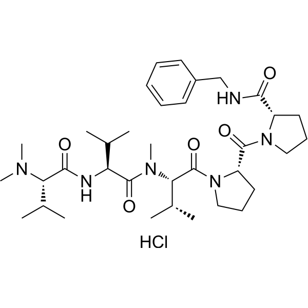 注射用配方1: DMSO : Tween 80: Saline = 10 : 5 : 85 (如: 100 μL DMSO → 50 μL Tween 80 → 850 μL Saline)(IP/IV/IM/SC等) *生理盐水/Saline的制备:将0.9g氯化钠/NaCl溶解在100 mL ddH ₂ O中,得到澄清溶液。 注射用配方 2: DMSO : PEG300 :Tween 80 : Saline = 10 : 40 : 5 : 45 (如: 100 μL DMSO → 400 μL PEG300 → 50 μL Tween 80 → 450 μL Saline) 注射用配方 3: DMSO : Corn oil = 10 : 90 (如: 100 μL DMSO → 900 μL Corn oil) 示例: 以注射用配方 3 (DMSO : Corn oil = 10 : 90) 为例说明, 如果要配制 1 mL 2.5 mg/mL的工作液, 您可以取 100 μL 25 mg/mL 澄清的 DMSO 储备液,加到 900 μL Corn oil/玉米油中, 混合均匀。 View More