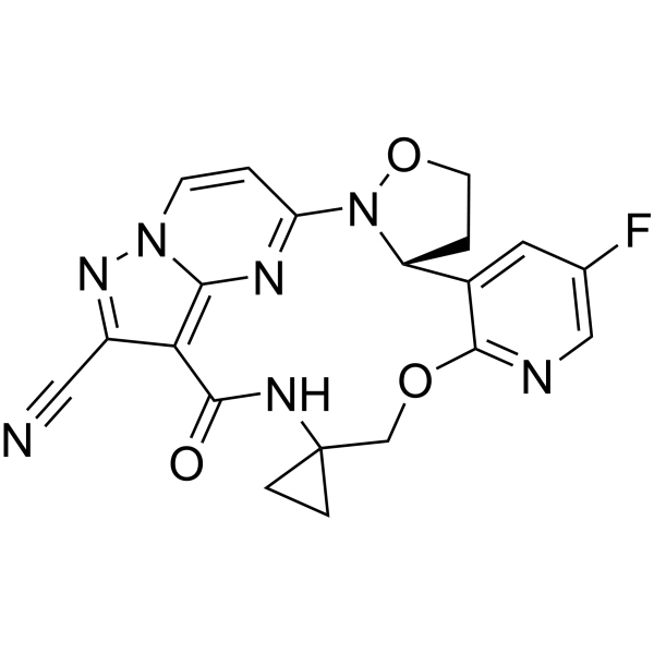 V117277 | SMU-037 | SMU-037 是一种口服有效的选择性 ROS1 抑制剂,具有高效性(IC₅₀ = 6.8 nM)和穿过血脑屏障的能力。 | |