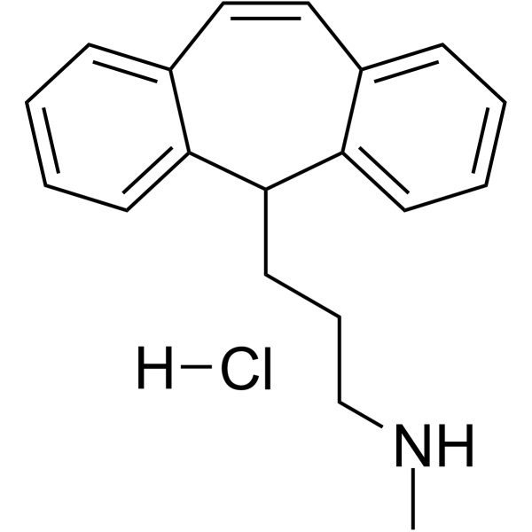 Protriptyline hydrochloride is a dibenzocycloheptene-derivative tricyclic antidepressant (TCA). TCAs are structurally similar to phenothiazines. They contain a tricyclic ring system with an alkyl amine substituent on the central ring. In non-depressed individuals, protriptyline does not affect mood or arousal, but may cause sedation. In depressed individuals, protriptyline exerts a positive effect on mood. TCAs are potent inhibitors of serotonin and norepinephrine reuptake. In addition, TCAs down-regulate cerebral cortical β-adrenergic receptors and sensitize post-synaptic serotonergic receptors with chronic use. The antidepressant effects of TCAs are thought to be due to an overall increase in serotonergic neurotransmission. TCAs also block histamine H1 receptors, alpha1-adrenergic receptors and muscarinic receptors, which accounts for their sedative, hypotensive and anticholinergic effects (e.g. blurred vision, dry mouth, constipation, urinary retention), respectively. See toxicity section below for a complete listing of side effects. Protriptyline may be used for the treatment of depression. Protriptyline is a Tricyclic Antidepressant. Protriptyline is a tricyclic antidepressant that was previously widely used in the therapy of major depression. Most of the tricyclic antidepressants have been shown to cause a low rate of mild and transient serum enzyme elevations and rare cases of clinically apparent acute cholestatic liver injury. The potential hepatotoxicity specifically of protriptyline, however, has not been well defined. Protriptyline hydrochloride is a dibenzocycloheptene-derivative tricyclic antidepressant (TCA). TCAs are structurally similar to phenothiazines. They contain a tricyclic ring system with an alkyl amine substituent on the central ring. In non-depressed individuals, protriptyline does not affect mood or arousal, but may cause sedation. In depressed individuals, protriptyline exerts a positive effect on mood. TCAs are potent inhibitors of serotonin and norepinephrine reuptake. In addition, TCAs down-regulate cerebral cortical β-adrenergic receptors and sensitize post-synaptic serotonergic receptors with chronic use. The antidepressant effects of TCAs are thought to be due to an overall increase in serotonergic neurotransmission. TCAs also block histamine H1 receptors, α1-adrenergic receptors and muscarinic receptors, which accounts for their sedative, hypotensive and anticholinergic effects (e.g. blurred vision, dry mouth, constipation, urinary retention), respectively. See toxicity section below for a complete listing of side effects. Protriptyline may be used for the treatment of depression. Tricyclic antidepressant similar in action and side effects to IMIPRAMINE. It may produce excitation. See also: Protriptyline Hydrochloride (has salt form). Drug Indication For the treatment of depression. Mechanism of Action Protriptyline acts by decreasing the reuptake of norepinephrine and serotonin (5-HT). ACTION OF TRICYCLIC ANTIDEPRESSANTS ON METAB OF CATECHOLAMINES & INDOLEAMINES IN BRAIN HAS CONTRIBUTED SIGNIFICANTLY TO "BIOGENIC AMINE HYPOTHESIS" OF DEPRESSION. ... /ALL/ BLOCK RE-UPTAKE OF NOREPINEPHRINE BY ADRENERGIC NERVE TERMINALS. /DEMETHYLATED ANALOGS ARE MORE POTENT IN THIS ACTION/ /TRICYCLIC ANTIDEPRESSANTS/ |
