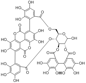 Interactions In order to find plants containing polyphenolic compounds that can inhibit melanin biosynthesis, we discovered a novel combination: Siberian larch (Larix sibirica) extract (normalized to 80% taxin) and pomegranate fruit (Punica granatum) extract (containing 20% punicin). This combination showed a synergistic inhibitory effect on melanin biosynthesis in Melan-a cells. Compared with Siberian larch or pomegranate extract alone, the combination of Siberian larch and pomegranate extract (1:1) reduced melanin content by 2-fold without a corresponding effect on cell viability. Siberian larch and pomegranate fruit extract inhibited the expression of melanocyte-specific genes tyrosinase (Tyr), microphthalmia transcription factor (Mitf), and melanosome structural proteins (Pmel17 and Mart1), but did not inhibit tyrosinase activity. These results indicate that the mechanism by which Siberian larch and pomegranate extracts, alone or in combination, inhibit melanin biosynthesis is through downregulating the expression of melanocyte-specific genes, rather than inhibiting tyrosinase activity. PMID:22714008 Terminalia catappa L. is a commonly used folk remedy in Taiwan for the prevention of liver cancer and the treatment of hepatitis. In this article, the authors investigated the protective effects of the aqueous extract of Terminalia catappa leaves (TCE) and its main tannin component, punicin, against bleomycin-induced genotoxicity in Chinese hamster ovary cells. Pretreatment with trichloroethylene (TCE) or punicin prevented bleomycin-induced hgprt gene mutations and DNA strand breaks. TCE and punicin inhibited the generation of bleomycin-induced intracellular free radicals (superoxide and hydrogen peroxide). The effectiveness of TCE and punicin against bleomycin-induced genotoxicity may be at least partly attributed to their antioxidant capabilities. PMID:10773401 The authors investigated the effects of punicalin (PC) on benzo[a]pyrene (BP)-induced DNA adducts in vitro and in vivo. Incubation of rat liver microsomes, appropriate cofactors, and DNA with BP (1 μM) in solvent or in the presence of punicalin (1–40 μM) showed dose-dependent inhibition of the generated DNA adducts, with near-complete inhibition (97%) at 40 μM. However, in in vitro non-microsomal systems, PC failed to inhibit BPDE-induced DNA adducts, suggesting that the inhibition of microsomal BP-DNA adducts is due to PC inhibiting P450 1A1. To determine its in vivo efficacy, female S/D rats were administered pungent glycosides via diet (1500 ppm; approximately 19 mg/day/rat) or subcutaneously via polymer implants (two 2 cm, 200 mg, drug loading 20%; each implant containing 40 mg PC), followed by continuous low-dose BP treatment via subcutaneous implants (2 cm, 200 mg, drug loading 10%; each implant containing 20 mg BP). Rats were sacrificed after 10 days. Lung DNA analysis using the (32) P-post-labeling method showed that implant-administered PC significantly inhibited DNA adducts (60%; p=0.029), while the inhibitory effect of the dietary route was weaker (34%), but not statistically significant. Furthermore, the total PC dose administered via implants was approximately 38 times lower than that administered via the dietary route. Lung microsomal analysis showed significantly inhibited cytochrome P450 1A1 activity and significantly increased glutathione levels. PC release from the implants was biphasic, with an initial burst followed by a gradual decrease. Ultra-high performance liquid chromatography (UHPLC) analysis showed that PC was not detected in plasma, but its hydrolysis product, ellagic acid, was readily detectable. The concentration of ellagic acid in the plasma of the implanted group (589 ± 78 ng/mL) was more than two orders of magnitude higher than that of the dietary group (4.36 ± 0.83 ng/mL). Our data collectively suggest that delivery of PC via implantation significantly reduces its effective dose, and the inhibition of DNA adducts in vivo may be attributed to the conversion of PC to ellagic acid. PMID:22234049 Punicin and punicin, isolated from the leaves of Terminalia catappa L., are used to treat dermatitis and hepatitis. Both compounds possess strong antioxidant activity. This study evaluated the anti-hepatotoxic effects of punicin and punicin on carbon tetrachloride (CCl4)-induced hepatotoxicity in rats. CCl4 administration increased serum aspartate aminotransferase (AST) and alanine aminotransferase (ALT) levels, while drug treatment decreased these enzyme levels. Drug treatment also improved the histological changes around the central hepatic vein and CCl4-induced oxidative damage. Results showed that both punicalin and punicalin possessed anti-hepatotoxic activity, but larger doses of punicalin induced liver damage. Therefore, even though tannins have strong antioxidant activity at very low doses, high-dose treatment can still induce cell damage. PMID:9720629 Antidote and First Aid Measures /SRP:/ Immediate First Aid Measures: Ensure adequate decontamination has been performed. If the patient stops breathing, begin artificial respiration immediately, preferably using a ventilator on demand, bag-valve-mask respirator, or simple breathing mask, following training instructions. Perform cardiopulmonary resuscitation if necessary. Immediately flush contaminated eyes with running water. Do not induce vomiting. If vomiting occurs, tilt the patient forward or place them in the left lateral decubitus position (head down if possible) to maintain an open airway and prevent aspiration. Keep the patient calm and maintain normal body temperature. Seek medical attention. /Class A and Class B Poisons/ /SRP:/ Basic Treatment: Establish a patent airway (using an oropharyngeal or nasopharyngeal airway if necessary). Suction as necessary. Observe for signs of respiratory failure and provide assisted ventilation if necessary. Administer oxygen via a non-invasive ventilation mask at a flow rate of 10 to 15 liters per mi