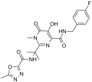 Raltegravir is a pyrimidone that is pyrimidin-4(3H)-one in which the hydrogens at positions 2, 3, 5 and 6 are replaced by 2-[(5-methyl-1,3,4-oxadiazole-2-carbonyl)amino]propan-2-yl, methyl, hydroxy, and N-[(4-fluorophenyl)methyl]aminoacyl groups, respectively. It is an antiretroviral drug used for treatment of HIV infection. It has a role as an antiviral drug and a HIV-1 integrase inhibitor. It is a 1,2,4-oxadiazole, a dicarboxylic acid amide, a member of monofluorobenzenes, a pyrimidone, a hydroxypyrimidine and a secondary carboxamide.