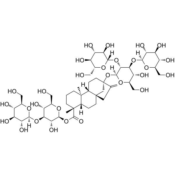 莱鲍迪苷I(Reb I)已证明能够通过苦味信号通路以浓度依赖性方式刺激肠内分泌细胞释放GLP-1。在生化研究中,Reb I与葡萄糖基转移酶相互作用,通过添加具有1→3连接的糖单元促进莱鲍迪苷A向Reb I的生物转化。对包括Reb I在内的甜菊糖苷的研究表明,这些化合物可以激活对细胞葡萄糖转运至关重要的PI3K/Akt信号通路。Reb I在细胞中具有抗氧化作用,有助于减轻氧化应激。在溶解度研究中,Reb I在乙醇中溶解度有限(0.5 mg/mL,0.44 mM),需要超声和加热辅助。