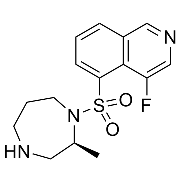 在猴眼中的浓度分别为 0.1% 至 0.4% 和兔眼中的浓度为 0.0625% 至 0.5% 时,dipasudil (K-115) 以浓度依赖性方式降低眼内压 (IOP)[1]。神经挤压 (NC) 后,视网膜神经节细胞 (RGC) 表现出迪帕舒地尔(K-115;1 mg/kg,每日口服)的神经保护作用。此外,在小鼠中,里帕舒地尔可以防止轴突损伤引起的氧化应激。 NC 损伤后 RGC 中 ROS 的时间依赖性产生可被 dipasudil 抑制 [3]。