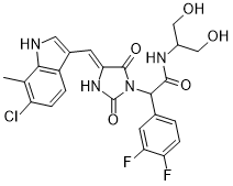 InChI=1S/C24H21ClF2N4O5/c1-11-16(25)4-3-15-13(8-28-20(11)15)7-19-23(35)31(24(36)30-19)21(22(34)29-14(9-32)10-33)12-2-5-17(26)18(27)6-12/h2-8,14,21,32-33,35H,9-10H2,1H3,(H,29,34)(H,30,36)/b13-7+