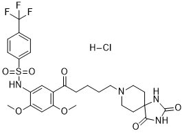 InChI=1S/C27H31F3N4O7S.ClH/c1-40-22-16-23(41-2)20(33-42(38,39)18-8-6-17(7-9-18)27(28,29)30)15-19(22)21(35)5-3-4-12-34-13-10-26(11-14-34)24(36)31-25(37)32-26;/h6-9,15-16,33H,3-5,10-14H2,1-2H3,(H2,31,32,36,37);1H