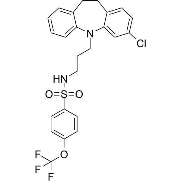 RTC-5是一种经过改造的三环化合物,具体而言,它是一种二苯并氮杂卓衍生物,其母体抗精神病药物的碱性二甲胺侧链被中性极性磺酰胺官能团(通过三碳链连接的4-三氟甲氧基苯磺酰胺)所取代。这一关键修饰旨在消除母体分子的中枢神经系统相关药理作用(例如,多巴胺受体拮抗作用),同时保留并优化其抗癌“副作用”[1]。