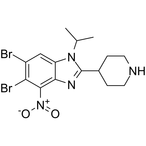 InChI=1S/C15H18Br2N4O2/c1-8(2)20-11-7-10(16)12(17)14(21(22)23)13(11)19-15(20)9-3-5-18-6-4-9/h7-9,18H,3-6H2,1-2H3