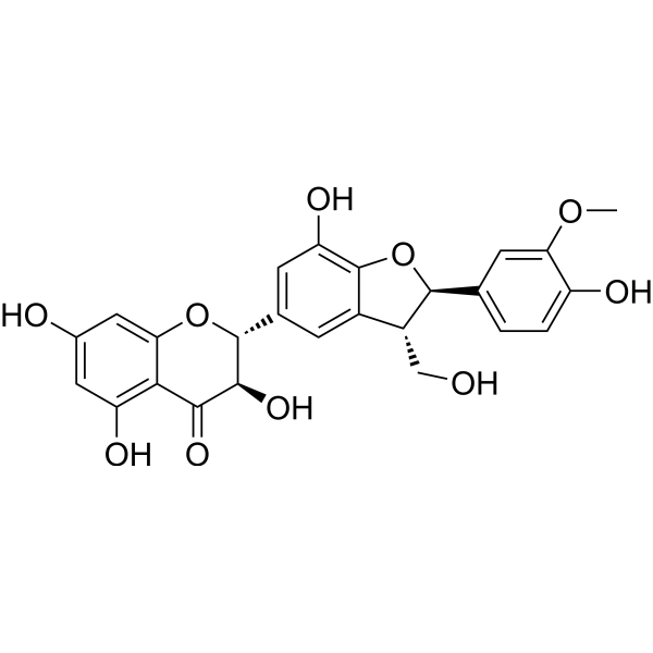 水飞蓟素是从水飞蓟(Silybum marianum)中分离得到的一种黄酮木脂素,已被证实具有抑制脂氧合酶和前列腺素合成酶的活性。它可作为自由基清除剂、脂氧合酶抑制剂、前列腺素拮抗剂和代谢产物发挥作用。它是一种黄酮木脂素,属于1-苯并呋喃类化合物,同时也是一种多酚、芳香醚和仲α-羟基酮。