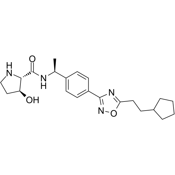 C[C@@H](C1=CC=C(C=C1)C2=NOC(=N2)CCC3CCCC3)NC(=O)[C@@H]4[C@H](CCN4)O