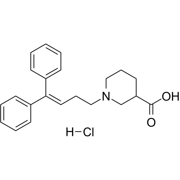 1-(4,4-Diphenylbut-3-enyl)-3-piperidinic acid is a diarylmethane. The GABAergic system in the spinal cord has been shown to be involved in neuropathic pain in various animal models. GABA transporters (GATs) play a role in controlling synaptic clearance of GABA; however, their role in neuropathic pain remains unclear. In this study, we used a sciatic nerve ligation mouse model to compare betaine/GABA transporter (BGT-1) with other GAT isoforms to determine its role in neuropathic pain. 1-(3-(9H-carbazol-9-yl)-1-propyl)-4-(2-methoxyphenyl)-4-piperidinol (NNC05-2090) is a moderately selective inhibitor of BGT-1 that showed anti-hyperalgesic effects in model mice via both intrathecal and intravenous administration. On the other hand, the selective GAT-1 inhibitor SKF89976A showed weak anti-hyperalgesic activity, while the selective GAT-3 inhibitor (S)-SNAP5114 had no anti-hyperalgesic activity. A systematic analysis of GABA uptake by these compounds in CHO cells stably expressing BGT-1 revealed that NNC05-2090 inhibited not only BGT-1 but also serotonin, norepinephrine, and dopamine transporters. Substrate uptake assays in CHO cells stably expressing each transporter showed IC50 values of 5.29, 7.91, and 4.08 μM for NNC05-2090, respectively. These values are similar to the IC50 value of BGT-1 (10.6 μM). These results indicate that the anti-hyperalgesic effect of NNC05-2090 is due to its inhibitory effect on BGT-1 and monoamine transporters. [1] The transport of the amino acid GABA to neurons and glial cells plays a key role in regulating the effects of GABA on the vertebrate retina. We investigated the regulatory effect of glutamate (a potential neurotransmitter in vertebrate photoreceptor cells) on GABA-induced transport currents in retinal level cells. We used whole-cell voltage clamp technology to detect the effects of enzymatically isolated ray lateral level cells. The inward current induced by GABA (1 mM) was completely inhibited by the GABA transport inhibitors tiagabin (10 μM) and SKF89976A (100 μM), but was not affected by 100 μM cucurbitacin. Pre-application of 100 μM glutamate significantly reduced the GABA-induced current. Glutamate inhibited the dose-response curve of GABA, but did not cause a transverse shift in the curve or change the voltage dependence of the current. The ionotropic glutamate receptor agonists fucoidan and AMPA also reduced GABA-induced currents, the effects of which could be blocked by the ionotropic glutamate receptor antagonist 6-cyano-7-nitroquinoxaline. NMDA neither induced nor altered GABA-induced currents, and metabolized glutamate analogs had no effect. The inhibitory effects of glutamate and fucoidan on GABA-induced currents were weakened when extracellular calcium ions were removed or when a high concentration of the calcium chelator BAPTA was added to the recording electrode. Caffeine (5 mM) and carotenoids (2 nM), which are known to alter intracellular calcium ion levels, also reduced GABA-induced currents, but simple depolarization-induced increases in calcium ion concentration did not have this effect. Our data suggest that glutamate regulates GABA transport in retinal cells through a calcium-dependent process, implying a close physical link between calcium-permeable glutamate receptors and GABA transporters in these cells. [2]