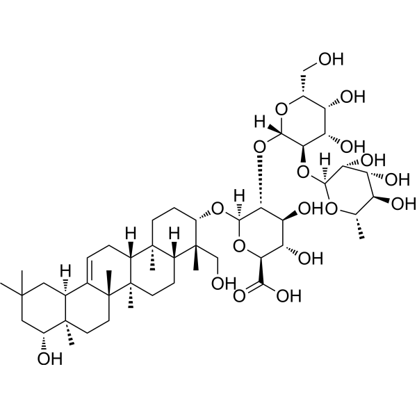 InChI=1S/C48H78O18/c1-21-29(52)31(54)35(58)40(61-21)65-37-32(55)30(53)24(19-49)62-41(37)66-38-34(57)33(56)36(39(59)60)64-42(38)63-28-12-13-45(5)25(46(28,6)20-50)11-14-48(8)26(45)10-9-22-23-17-43(2,3)18-27(51)44(23,4)15-16-47(22,48)7/h9,21,23-38,40-42,49-58H,10-20H2,1-8H3,(H,59,60)/t21-,23-,24+,25+,26+,27+,28-,29-,30-,31+,32-,33-,34-,35+,36-,37+,38+,40-,41-,42+,44+,45-,46+,47+,48+/m0/s1