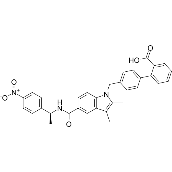 CC1=C(N(C2=C1C=C(C=C2)C(=O)N[C@@H](C)C3=CC=C(C=C3)[N+](=O)[O-])CC4=CC=C(C=C4)C5=CC=CC=C5C(=O)O)C
