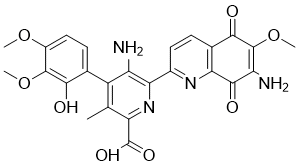 InChI=1S/C25H22N4O8/c1-9-14(10-6-8-13(35-2)23(36-3)20(10)30)15(26)19(29-17(9)25(33)34)12-7-5-11-18(28-12)22(32)16(27)24(37-4)21(11)31/h5-8,30H,26-27H2,1-4H3,(H,33,34)