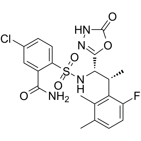 CC1=C(C(=C(C=C1)F)[C@@H](C)[C@@H](C2=NNC(=O)O2)NS(=O)(=O)C3=C(C=C(C=C3)Cl)C(=O)N)C