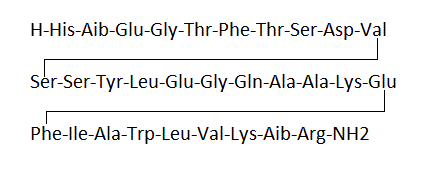 HXEGTFTSDVSSYLEGQAAKEFIAWLVKXR (N-((N-(L-histidyl)-2-aminoisobutyryl)-L-alpha-glutamyl-glycyl-L-threonyl-L-phenylalanyl-L-threonyl-L-seryl-L-alpha-aspartyl-L-valyl-L-seryl-L-seryl-L-tyrosyl-L-leucyl-L-alpha-glutamyl-glycyl-L-glutaminyl-L-alanyl-L-alanyl-L-lysyl-L-alpha-glutamyl-L-phenylalanyl-L-isoleucyl-L-alanyl-L-tryptophyl-L-leucyl-L-valyl-L-lysyl)-2-aminoisobutyryl)-L-argininamide H-His-Aib-Glu-Gly-Thr-Phe-Thr-Ser-Asp-Val-Ser-Ser-Tyr-Leu-Glu-Gly-Gln-Ala-Ala-Lys-Glu-Phe-Ile-Ala-Trp-Leu-Val-Lys-Aib-Arg-NH2