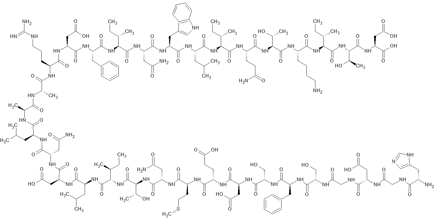 InChI=1S/C164H252N44O55S/c1-21-77(11)126(156(255)187-95(44-46-114(167)214)141(240)206-130(83(17)211)160(259)186-93(42-33-34-49-165)140(239)202-129(80(14)24-4)159(258)208-131(84(18)212)161(260)200-111(163(262)263)66-125(230)231)203-151(250)100(54-76(9)10)189-145(244)103(57-88-67-175-92-41-32-31-40-90(88)92)192-147(246)105(60-116(169)216)199-157(256)127(78(12)22-2)204-152(251)102(56-87-38-29-26-30-39-87)190-149(248)109(64-123(226)227)195-137(236)94(43-35-50-174-164(171)172)183-134(233)82(16)179-133(232)81(15)180-142(241)98(52-74(5)6)188-146(245)104(59-115(168)215)194-150(249)110(65-124(228)229)196-143(242)99(53-75(7)8)198-158(257)128(79(13)23-3)205-162(261)132(85(19)213)207-153(252)106(61-117(170)217)193-139(238)97(48-51-264-20)185-138(237)96(45-47-120(220)221)184-148(247)108(63-122(224)225)197-155(254)113(72-210)201-144(243)101(55-86-36-27-25-28-37-86)191-154(253)112(71-209)182-119(219)70-177-136(235)107(62-121(222)223)181-118(218)69-176-135(234)91(166)58-89-68-173-73-178-89/h25-32,36-41,67-68,73-85,91,93-113,126-132,175,209-213H,21-24,33-35,42-66,69-72,165-166H2,1-20H3,(H2,167,214)(H2,168,215)(H2,169,216)(H2,170,217)(H,173,178)(H,176,234)(H,177,235)(H,179,232)(H,180,241)(H,181,218)(H,182,219)(H,183,233)(H,184,247)(H,185,237)(H,186,259)(H,187,255)(H,188,245)(H,189,244)(H,190,248)(H,191,253)(H,192,246)(H,193,238)(H,194,249)(H,195,236)(H,196,242)(H,197,254)(H,198,257)(H,199,256)(H,200,260)(H,201,243)(H,202,239)(H,203,250)(H,204,251)(H,205,261)(H,206,240)(H,207,252)(H,208,258)(H,220,221)(H,222,223)(H,224,225)(H,226,227)(H,228,229)(H,230,231)(H,262,263)(H4,171,172,174)/t77-,78-,79-,80-,81-,82-,83+,84+,85+,91-,93-,94-,95-,96-,97-,98-,99-,100-,101-,102-,103-,104-,105-,106-,107-,108-,109-,110-,111-,112-,113-,126-,127-,128-,129-,130-,131-,132-/m0/s1