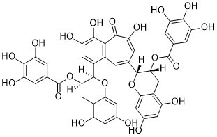 茶黄素 3,3'-二没食子酸酯是红茶中天然存在的主要茶黄素成分,由茶叶发酵过程中儿茶素氧化形成[1][2]。其抑制寨卡病毒的机制涉及与寨卡病毒 NS2B-NS3 蛋白酶的活性位点结合,阻止底物裂解和病毒多聚蛋白的加工[1]。茶黄素 3,3'-二没食子酸酯预处理在 HCT116 细胞中具有更高的抗增殖功效,这可能与细胞摄取增加或更早干预细胞周期进程有关[2]。