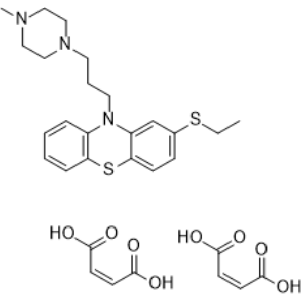 噻乙哌嗪是一种哌嗪吩噻嗪衍生物,也是一种多巴胺拮抗剂,用作止吐药。噻乙哌嗪阻断延髓化学感受器触发区(CTZ)的突触后多巴胺2(D2)受体,从而减少对大脑呕吐中枢的刺激。在外周,噻乙哌嗪阻断胃肠道的迷走神经。此外,该药还表现出通过毒蕈碱受体、H1受体和α1受体介导的拮抗活性。 噻乙哌嗪是一种多巴胺拮抗剂,尤其适用于治疗麻醉、轻度致吐性癌症化疗药物、放射疗法和毒素引起的恶心和呕吐。这种哌嗪类吩噻嗪类药物不能预防眩晕或晕动病。(摘自《美国医学会药物评价年鉴》,1994年,第457页) 药物适应症 用于治疗或缓解恶心和呕吐。 作用机制 噻乙哌嗪是多巴胺受体1、2和4型、5-HT受体2A和2C型、毒蕈碱受体1至5型、α1受体和组胺H1受体的拮抗剂。噻乙哌嗪的抗精神病作用是由于其对多巴胺和5-HT2受体的拮抗作用,且对5-HT2受体的活性高于对多巴胺2型受体的活性。这或许可以解释其缺乏锥体外系副作用的原因。噻乙哌嗪似乎不会阻断结节漏斗束内的多巴胺,这解释了其高催乳素血症发生率低于典型抗精神病药物或利培酮的原因。噻乙哌嗪还会拮抗毒蕈碱受体、H1受体和α1受体。 边缘系统和尾状核中存在一种腺苷酸环化酶,该酶可被多巴胺特异性激活。……该酶的激活……会被……吩噻嗪类药物阻断。……治疗效果和副作用可能与抑制多巴胺激活腺苷酸环化酶有关。吩噻嗪类药物 ……吩噻嗪类药物阻断多巴胺受体,增加纹状体中多巴胺的周转率。周转率的增加被认为是神经反馈机制的结果。……黑质和腹侧被盖区中已鉴定的多巴胺能神经元的放电活动因抗精神病药物吩噻嗪类药物而增加。吩噻嗪类药物 治疗用途 止吐药;多巴胺拮抗剂 兽医实验应用:研究了噻乙拉嗪对兔前庭性眼球震颤的影响。通过扭转摆动诱发眼球震颤。噻乙哌嗪显示出明显的抑制作用,但其作用强度和持续时间均弱于桂利嗪和舒必利。 实验应用(兽医):喂食0.4公斤狗粮的犬只随后肌注0.86毫克/公斤噻乙哌嗪,并使用60CO远程放射治疗装置进行照射。导致50%对照犬呕吐的辐射剂量(ED50)为170拉德。噻噻嗪的ED50增加至320 rad。 噻噻嗪是一种吩噻嗪类止吐药,可有效缓解各种原因引起的恶心和呕吐。它也可能对眩晕的治疗有效。/马来酸盐/ 有关噻噻嗪(共12种)的更多治疗用途(完整)数据,请访问HSDB记录页面。 药物警告 孕妇和12岁以下儿童禁用。其他禁忌症和副作用与其他吩噻嗪类药物相同。马来酸盐类药物:对于患有严重肝病和癫痫的患者以及老年患者,应谨慎使用这些药物。吩噻嗪类止吐药:对于未经治疗的癫痫患者以及正在戒断中枢抑制剂(如酒精、巴比妥类药物和苯二氮卓类药物)的患者,应极其谨慎地使用吩噻嗪类药物,甚至禁用。如果逐渐增加剂量并同时维持抗惊厥药物治疗,则可用于癫痫患者。 /吩噻嗪类/ ……使用吩噻嗪类药物治疗恶心和呕吐时,应注意与使用强效镇痛药治疗疼痛时相同的注意事项,因为它们可能会掩盖急性外科疾病或神经系统综合征的诊断症状。/吩噻嗪类/ 有关乙基硫代哌嗪(共31条)的更多药物警告(完整)数据,请访问HSDB记录页面。 药效学 噻乙哌嗪是一种非典型抗精神病药物,用于治疗精神分裂症的阴性症状和阳性症状、双相情感障碍的急性躁狂、躁动以及痴呆症的精神病性症状。未来用途可能包括治疗强迫症和自闭症的严重行为障碍。噻乙哌嗪在结构和药理学上与氯氮平相似,可与α1受体、多巴胺受体、组胺H1受体、毒蕈碱受体和5-羟色胺2型(5-HT2)受体结合。 |