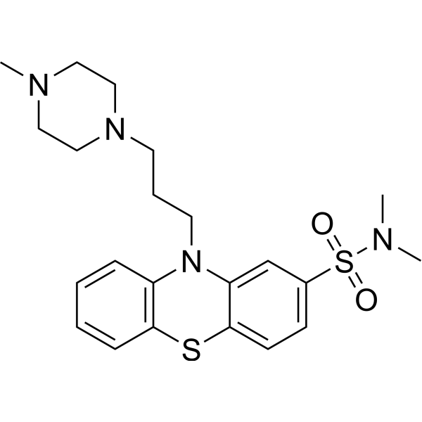 硫丙嗪是一种吩噻嗪衍生物,其吩噻嗪三环在2位具有二甲基氨基磺酰基取代基,在N-10位具有3-(4-甲基哌嗪-1-基)丙基取代基。它是一种吩噻嗪类抗精神病药物。它属于吩噻嗪类、N-烷基哌嗪类、N-甲基哌嗪类和磺酰胺类化合物。硫丙嗪是一种强效抗精神病神经安定剂。硫丙嗪具有显著的僵直和抗阿扑吗啡活性,同时伴有相对较弱的镇静、降温和解痉作用。它几乎没有抗血清素和降压作用,也没有抗组胺作用。它用于治疗各种类型的急性和慢性精神分裂症,包括对常用抗精神病药物无效的病例。躁狂症。