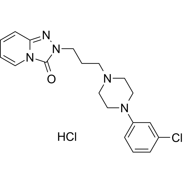 Trazodone is rapidly absorbed in the gastrointestinal tract after oral administration, with a bioavailability of 63-91% and an AUC0-t of 18193.0 ng·h/mL. The effect of food on absorption varies from person to person and can sometimes lead to a decrease in the Cmax of trazodone. In 8 healthy volunteers, the Cmax was 1.47 ± 0.16 μg/mL after eating and 1.88 ± 0.42 μg/mL after fasting. The mean Tmax after a single 300 mg dose was 8 hours. Food can increase absorption by up to 20%. Less than 1% of the oral dose is excreted unchanged in the urine. In a pharmacokinetic study, approximately 60-70% of the radiolabeled drug was excreted in the urine within 48 hours. Approximately 9-29% of the drug was excreted in the feces within 60 to 100 hours. According to FDA medical review, the kidneys are responsible for 70% to 75% of trazodone excretion. Approximately 21% of trazodone is excreted in feces, and 0.13% of the unchanged drug is excreted unchanged in urine. A single-dose pharmacokinetic study in eight volunteers taking trazodone determined its volume of distribution to be 0.84 ± 0.16 L/kg. The FDA's medical review report on trazodone indicates a volume of distribution ranging from 0.47 to 0.84 L/kg. Compared to younger volunteers, older volunteers showed a lower total apparent clearance in a fasting state (5.1 L/h vs. 10.8 L/h). Another pharmacokinetic study determined that the total clearance of trazodone after a single dose in eight healthy subjects was 5.3 ± 0.9 L/h. In another study, the mean peak plasma concentrations of trazodone after oral administration of 25, 50, or 100 mg in healthy fasting adults were 490, 860, and 1620 ng/mL, respectively. The areas under the plasma concentration-time curve (AUC) for the 25 mg, 50 mg, and 100 mg dose groups were 3.44, 5.95, and 11.19 μg·hr/mL, respectively. Currently, cross-correlation data on AUC in fasting and non-fasting patients are limited; however, the presence of food appears to slightly increase the AUC of trazodone. In one study, after a single oral dose of 25 mg radiolabeled trazodone in healthy adults, the mean peak plasma drug concentrations were reached at 1.5 hours and 2.5 hours post-administration, respectively, in fasting and non-fasting states, at 650 ng/mL and 480 ng/mL. /Breast Milk/ A study investigated breast milk excretion after oral administration of a single trazodone tablet (50 mg) in six lactating women. Based on the areas under the plasma and breast milk concentration curves, the breast milk/plasma ratio of trazodone was small: 0.142 ± 0.045 (mean ± standard deviation). Assuming an infant drinks 500 mL of breast milk every 12 hours, the amount of trazodone ingested through breast milk is less than 0.005 mg/kg, while the mother's intake is 0.77 mg/kg. Therefore, it can be concluded that the amount of trazodone ingested by the infant through breast milk is very small. After oral administration of trazodone on an empty stomach, peak plasma concentrations occur approximately 1 hour after administration; when taken with food, peak plasma concentrations occur approximately 2 hours after administration. Steady-state plasma drug concentrations are typically reached within 4 days after oral administration of trazodone (25 mg each time, 2 or 3 times daily), but there is considerable inter-individual variability. For more complete data on the absorption, distribution, and excretion of trazodone (8 types), please visit the HSDB record page. Metabolism/Metabolites Trazodone is primarily metabolized and activated in the liver by the enzyme CYP3A4 to the active metabolite m-chlorophenylpiperazine (mCPP). The complete metabolic process of trazodone has not been fully elucidated. Other identified metabolites include dihydrodiol metabolites and carboxylic acids. Trazodone is extensively metabolized in the liver via hydroxylation, oxidation, N-oxidation, and pyridine ring cleavage. The hydroxylated metabolite and oxotriazopyridinepropionic acid (an inactive metabolite excreted in urine) are conjugated with glucuronic acid. In vitro studies indicate that the metabolism of trazodone to the active metabolite m-chlorophenylpiperazine is mediated by cytochrome P-450 (CYP) 3A4 isoenzymes. The manufacturer states that other metabolic pathways involved in trazodone metabolism are not fully elucidated. Animal studies indicate that trazodone does not induce its own metabolism. In vitro human liver microsomal studies show that trazodone is oxidatively cleaved by CYP3A4 to the active metabolite m-chlorophenylpiperazine (mCPP). Other metabolic pathways that may be involved in trazodone metabolism are not fully elucidated. Trazodone is extensively metabolized; less than 1% of the oral dose is excreted unchanged in the urine. Following oral administration of trazodone, approximately 70-75% of the dose is excreted in the urine within 72 hours, primarily as metabolites. About 20% of the oral trazodone is excreted in the urine as oxotriazopyridine propionic acid and its conjugates, and about 10% as dihydrodiol metabolites; less than 1% is excreted unchanged. The remaining portion of the oral drug is excreted primarily as metabolites via bile and in feces. Known metabolites of trazodone include p-hydroxytrazodone, epoxide trazodone, and 1-(3-chlorophenyl)piperazine. Trazodone is metabolized in the liver primarily through hydroxylation, N-dealkylation, N-oxidation, and pyridine ring cleavage. Cytochrome P450 (CYP) 3A4 catalyzes the formation of the major active metabolite, m-chlorophenylpiperazine (m-CPP). The metabolite can further bind with glucuronic acid or glutathione. CYP2D6 is responsible for the 4'-hydroxylation of m-CPP, generating at least one glutathione conjugate of m-CPP, namely a quinone imine-thiol adduct. The inactive metabolite oxotriazopyridine propionic acid and its conjugates account for approximately 20% of the total oral excretion. Less than 1% of the oral dose is excreted unchanged. Approximately 70-75% of the dose is excreted i