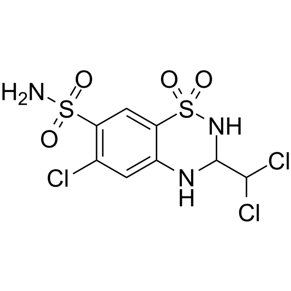 一种噻嗪类利尿剂,其性质与氢氯噻嗪相似。 (摘自《马丁代尔药典》,第30版,第830页) 三氯噻嗪是氢氯噻嗪的短效3-二氯甲基衍生物,属于噻嗪类利尿剂。 一种与氢氯噻嗪性质相似的噻嗪类利尿剂。(摘自《马丁代尔药典》,第30版,第830页) 另见:利血平;三氯噻嗪(成分);地塞米松;三氯噻嗪(成分)。 适应症 用于治疗水肿(包括心力衰竭相关性水肿)和高血压。 作用机制 三氯噻嗪似乎能抑制亨利氏袢升支对氯离子的主动重吸收。此外,它也可能对钠产生类似的作用。这些作用随后会改变近端小管中的电解质转运。这会导致钠、氯和水的排泄,从而产生利尿作用。作为一种利尿剂,三氯噻嗪通过钠-氯共转运蛋白抑制远端小管早期对氯的主动重吸收,导致钠、氯和水的排泄增加。噻嗪类药物(如三氯噻嗪)还通过与噻嗪类药物敏感的钠-氯转运蛋白结合,抑制钠离子跨肾小管上皮的转运。这导致钾通过钠钾交换机制的排泄增加。三氯噻嗪的降压机制尚不完全清楚,但可能与其作用于平滑肌中的碳酸酐酶或作用于同样存在于平滑肌中的大电导钙激活钾通道(KCa通道)有关。 ……苯并噻二嗪类药物对肾小管钠和氯的转运有直接作用……与碳酸酐酶无关。/噻嗪类利尿剂/ 噻嗪类药物抑制远端肾小管对钠和氯的重吸收。……作为一类药物……对远端肾小管阳离子分泌增加导致的钾排泄有重要作用。噻嗪类药物,特别是用于实验目的的静脉给药,可能会降低肾小球滤过率。噻嗪类利尿剂可能减少人体尿酸的排泄,从而增加血浆中尿酸的浓度。高尿酸血症的作用主要源于抑制肾小管对尿酸盐的分泌。与其他大多数利尿剂不同,噻嗪类利尿剂可降低肾脏对钙的排泄(相对于钠的排泄),并增加镁的排泄。噻嗪类利尿剂 噻嗪类利尿剂与负责氯利尿作用的特定肾脏受体之间的化学相互作用性质尚不清楚;尚未发现关键的酶促反应。噻嗪类利尿剂 有关三氯噻嗪(共11种)的更多作用机制(完整)数据,请访问HSDB记录页面。 治疗用途 抗高血压药;噻嗪类利尿剂 口服有效且长效的噻嗪类利尿剂和降压药。……按毫克计,其活性约为氯噻嗪的250倍。 噻嗪类药物……通常是治疗高血压的首选药物。由于噻嗪类药物仅引起有限的(10%)血压下降,因此它们适用于轻度高血压病例或作为其他药物的辅助治疗。噻嗪类利尿剂 噻嗪类利尿剂可作为辅助疗法,用于治疗充血性心力衰竭、肝硬化、皮质类固醇和雌激素治疗引起的水肿,以及各种肾功能不全引起的水肿……和妊娠引起的严重水肿。 /噻嗪类利尿剂/ 有关三氯噻嗪(共11种)的更多治疗用途(完整)数据,请访问HSDB记录页面。 药物警告 三氯噻嗪……由于其作用持续时间超过24小时,因此给药频率可能低于大多数噻嗪类药物。 应定期对所有患者进行血清电解质测定,以检测电解质失衡,例如低钠血症、低氯性碱中毒和低钾血症。噻嗪类利尿剂 噻嗪类利尿剂禁用于无尿症患者、对噻嗪类利尿剂或其他磺胺类药物过敏的患者,以及伴或不伴轻度水肿的健康孕妇。……肾病患者应谨慎使用,因为他们可能出现氮质血症。噻嗪类利尿剂 长期服用噻嗪类利尿剂的患者应定期检测血浆钾浓度。 /噻嗪类利尿剂/ 有关三氯噻嗪(共11条)的更多药物警告(完整)数据,请访问HSDB记录页面。 药效学 三氯噻嗪适用于治疗充血性心力衰竭、肝硬化以及皮质类固醇和雌激素治疗相关的水肿。三氯噻嗪也可用于治疗各种肾功能障碍引起的水肿,例如肾病综合征、急性肾小球肾炎和慢性肾功能衰竭。三氯噻嗪还可用于治疗高血压,既可作为单一治疗药物,也可增强其他降压药在更严重高血压中的疗效。与其他噻嗪类药物一样,三氯噻嗪可促进体内水分排出(利尿剂)。噻嗪类药物抑制肾脏远曲小管对钠离子/氯离子的重吸收。它们还会导致钾流失和血清尿酸升高。噻嗪类药物常用于治疗高血压,但其降压作用并非完全归因于其利尿活性。尽管其机制尚未完全阐明,但噻嗪类药物已被证实能够预防高血压相关的发病率和死亡率。噻嗪类药物通过激活血管平滑肌中的钙激活钾通道(大电导通道)并抑制血管组织中的多种碳酸酐酶,从而引起血管舒张。 |