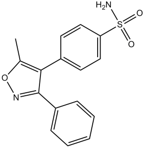 Drug Indications For the treatment of osteoarthritis and dysmenorrhea FDA Label Relief of symptoms of osteoarthritis or rheumatoid arthritis. Treatment of primary dysmenorrhea. Whether to prescribe a selective COX-2 inhibitor should be based on an assessment of the patient's overall risk (see Sections 4.3 and 4.4). Relief of symptoms of osteoarthritis or rheumatoid arthritis. Treatment of primary dysmenorrhea. Relief of symptoms of osteoarthritis or rheumatoid arthritis. Treatment of primary dysmenorrhea. Mechanism of Action Both COX-1 and COX-2 catalyze the conversion of arachidonic acid into prostaglandin (PG)H2, which is a precursor to prostaglandins and thromboxanes. Vardecoxib selectively inhibits cyclooxygenase-2 (COX-2), an enzyme that plays a crucial role in mediating inflammation and pain. Unlike non-selective nonsteroidal anti-inflammatory drugs (NSAIDs), vardecoxib does not inhibit platelet aggregation. Vardecoxib is an NSAID with anti-inflammatory, analgesic, and antipyretic effects. Studies suggest that vardecoxib reduces the production of prostaglandin precursors by inhibiting cyclooxygenase-2 (COX-2) activity. However, unlike most NSAIDs, vardecoxib does not inhibit the cyclooxygenase-1 (COX-1) isoenzyme in humans at therapeutic concentrations. Therapeutic Uses Vardecoxib is indicated for the relief of signs and symptoms of osteoarthritis and rheumatoid arthritis in adults. /US Product Label Includes/ Vardecoxib is indicated for the treatment of primary dysmenorrhea. /US Product Label Contains/ Drug Warnings Serious, potentially life-threatening skin reactions, including exfoliative dermatitis, erythema multiforme, Stevens-Johnson syndrome, or toxic epidermal necrolysis (TEN), have been reported in post-marketing surveillance of vardicoxib. There have been reports of deaths due to Stevens-Johnson syndrome or toxic epidermal necrolysis. While serious adverse reactions can occur at any time during vardicoxib treatment, the risk appears to be highest during the first two weeks of treatment. Patients with a history of sulfonamide allergy may be at higher risk of skin reactions, but patients without such allergies are also at risk of serious skin reactions. These reactions are rare, but have been reported to occur more frequently with vardicoxib than with other selective COX-2 inhibitors (such as celecoxib). Vardicoxib should be discontinued immediately if a rash or any other allergic reaction occurs. There is a risk of potentially fatal gastrointestinal ulcers, bleeding, and perforation. Most studies suggest that vardicoxib carries a lower risk of gastrointestinal ulceration compared to typical nonsteroidal anti-inflammatory drugs (NSAIDs); however, the relative risk remains to be determined. Caution should be exercised when using vardicoxib in patients at risk of gastrointestinal bleeding (e.g., those with a history of gastrointestinal bleeding or ulceration, those receiving oral corticosteroids or anticoagulants, those on long-term NSAID use, elderly patients, frail patients, smokers, or those with alcohol dependence). Alternative treatment options should be considered for patients at high risk of gastrointestinal bleeding. … Severe (rarely fatal) anaphylactic reactions have occurred in patients receiving NSAIDs, and anaphylactic reactions (e.g., anaphylactic shock, angioedema) have also been reported in post-marketing surveillance of vardicoxib. Such reactions have occurred in patients with or without a history of sulfonamide allergy. …Cross-sensitivity reactions may occur between aspirin and other NSAIDs. Aspirin is contraindicated in patients with bronchospasm who are allergic to aspirin. Avoid use in patients with aspirin triad. Patients with a history of asthma should use this medication with caution, as bronchospasm may occur. Vardecoxib may cause increased fluid retention or edema in patients with conditions that predispose to and/or worsen fluid retention (congestive heart failure or edema, pre-existing hypertension); additionally, patients with congestive heart failure have an increased risk of renal failure; these patients should start with the lowest effective dose of vardecoxib. For more drug warnings (full version) (16 in total) on vardecoxib, please visit the HSDB record page. Pharmacodynamics Vardecoxib is a selective cyclooxygenase-2 (COX-2) inhibitor, belonging to the class of nonsteroidal anti-inflammatory drugs (NSAIDs). Vardecoxib is used to treat osteoarthritis (OA) and dysmenorrhea or acute pain due to its anti-inflammatory, analgesic, and antipyretic effects. Unlike celecoxib, vardecoxib does not contain a sulfonamide chain and its metabolism does not require the CYP450 enzyme. 1. Vardecoxib (SC65872) is a highly selective cyclooxygenase-2 (COX-2) inhibitor (selectivity ratio to COX-1 >800) developed for anti-inflammatory and analgesic purposes. Its core structure is 4-[5-methyl-3-phenylisoxazol-4-yl]-benzenesulfonamide, which belongs to the isoxazolonamide class of nonsteroidal anti-inflammatory drugs (NSAIDs) [1] 2. In addition to inhibiting COX-2, vardecoxib can also regulate angiogenesis-related growth factors (VEGF, bFGF) in endothelial cells under hypoxia/LPS stimulation, suggesting its potential application value in inflammatory angiogenesis-related diseases (such as rheumatoid arthritis) [2] 3. Under chronic stress, vardecoxib exerts neuroprotective effects by reducing hippocampal COX-2 activity and increasing BDNF expression, thereby alleviating stress-induced anxiety and hormonal imbalance (elevated corticosterone). This indicates that it has potential application value in the treatment of stress-related neuropsychiatric disorders [3] |