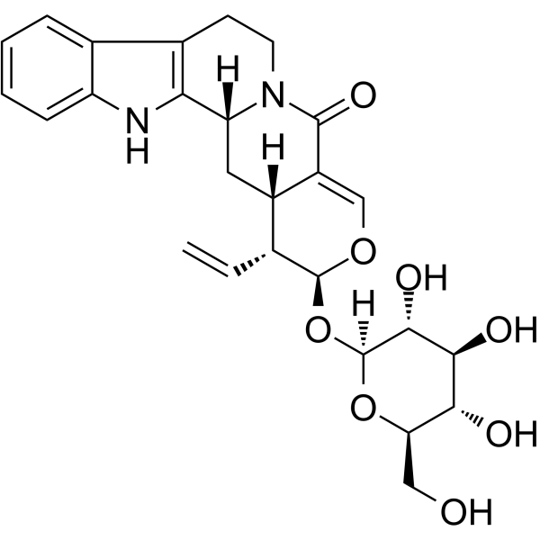 InChI=1S/C26H30N2O8/c1-2-12-15-9-18-20-14(13-5-3-4-6-17(13)27-20)7-8-28(18)24(33)16(15)11-34-25(12)36-26-23(32)22(31)21(30)19(10-29)35-26/h2-6,11-12,15,18-19,21-23,25-27,29-32H,1,7-10H2/t12-,15+,18-,19-,21-,22+,23-,25+,26+/m1/s1
