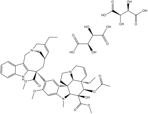 Vinorelbine tartrate is a ditartrate salt of a semi-synthetic alkaloid extracted from the leaves of Vinca rosea, possessing antitumor activity. Vinorelbine binds to tubulin, thereby inhibiting tubulin polymerization to form microtubules and spindles, ultimately leading to apoptosis in susceptible cancer cells. Inhibition of mitotic microtubules is associated with antitumor activity, while inhibition of axonal microtubules appears to be associated with vinorelbine's neurotoxicity. Compared to related Vinca rosea alkaloids, vinorelbine exhibits higher selectivity for mitotic microtubules in vitro than for axonal microtubules, which may explain its lower neurotoxicity. Furthermore, the drug also has radiosensitizing effects. (NCI04)