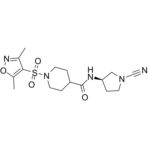 体外活性:VLX1570 是 b-AP15 的类似物,具有更高的效力和更高的溶解度。 VLX1570 优先抑制蛋白酶体 DUB 活性,而不抑制一组非蛋白酶体 DUB 的活性。 VLX1570 在体外结合并抑制泛素特异性蛋白酶 14 (USP14) 的活性,对 UCHL5(泛素 C 末端水解酶 5)的抑制活性相对较弱。用 VLX1570 治疗多发性骨髓瘤细胞会诱导蛋白酶体结合的高分子量多聚泛素缀合物的积累和细胞凋亡反应。激酶测定:26S 蛋白酶体 (1 nM) 制剂在测定缓冲液(25 mM Tris、5 mM MgCl2、10% 甘油、0.05 mg/mL BSA、2 mM ATP)中用 DMSO、VLX1570 或 b-AP15 预处理 2 分钟和 1 mM DTT),然后添加乌布罗丹明。使用 TECAN infinite 200 仪器在 37°C 下使用 Ex/Em = 490 nm/520 nm 监测荧光,每 10 秒读取一次数据,持续 30 分钟。对于 KMS 11 细胞的 UbVS 标记,使用缓冲液(50 mM HEPES pH 7.4、250 mM 蔗糖、10 mM MgCl2、2 mM ATP、1 mM DTT)在冰上裂解对照或处理细胞中的细胞沉淀 30 分钟并去除碎片通过离心。 25 μg 蛋白质用 1 μM UbVS 在 37°C 下标记 30 分钟。通过 SDS-PAGE 解析样品并进行免疫印迹。对于蛋白酶体的 UbVS 标记,将纯化的 19S 蛋白酶体 (50 nM) 用 DMSO、VLX1570 或 b-AP15 (50 μM) 在室温下预处理 10 分钟,然后用 1 μM HA-UbVS 在 37° 下标记 30 分钟C和通过免疫印迹。细胞测定:OPM-2 MM 细胞暴露于 0.5 μM VLX1570 3 小时,随后用 Ub-VS (1 μM) 标记 25 μg 全细胞裂解物,然后进行 SDS 凝胶电泳并使用 USP14 或 UCHL5 抗体进行免疫印迹。