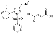 富马酸伏诺拉赞是伏诺拉赞的富马酸盐形式,伏诺拉赞是一种吡咯衍生物,属于可逆性钾离子竞争性酸阻滞剂(P-CAB),具有潜在的抗酸活性。服用后,伏诺拉赞特异性地竞争性结合胃氢钾ATP酶(H+/K+ ATPase)质子泵的钾离子(K+)结合位点或其附近区域,从而空间位阻抑制K+的结合。这阻断了K+对H+/K+ ATPase的激活,抑制了质子泵的活性,并阻止了胃酸分泌,从而降低了胃酸水平。