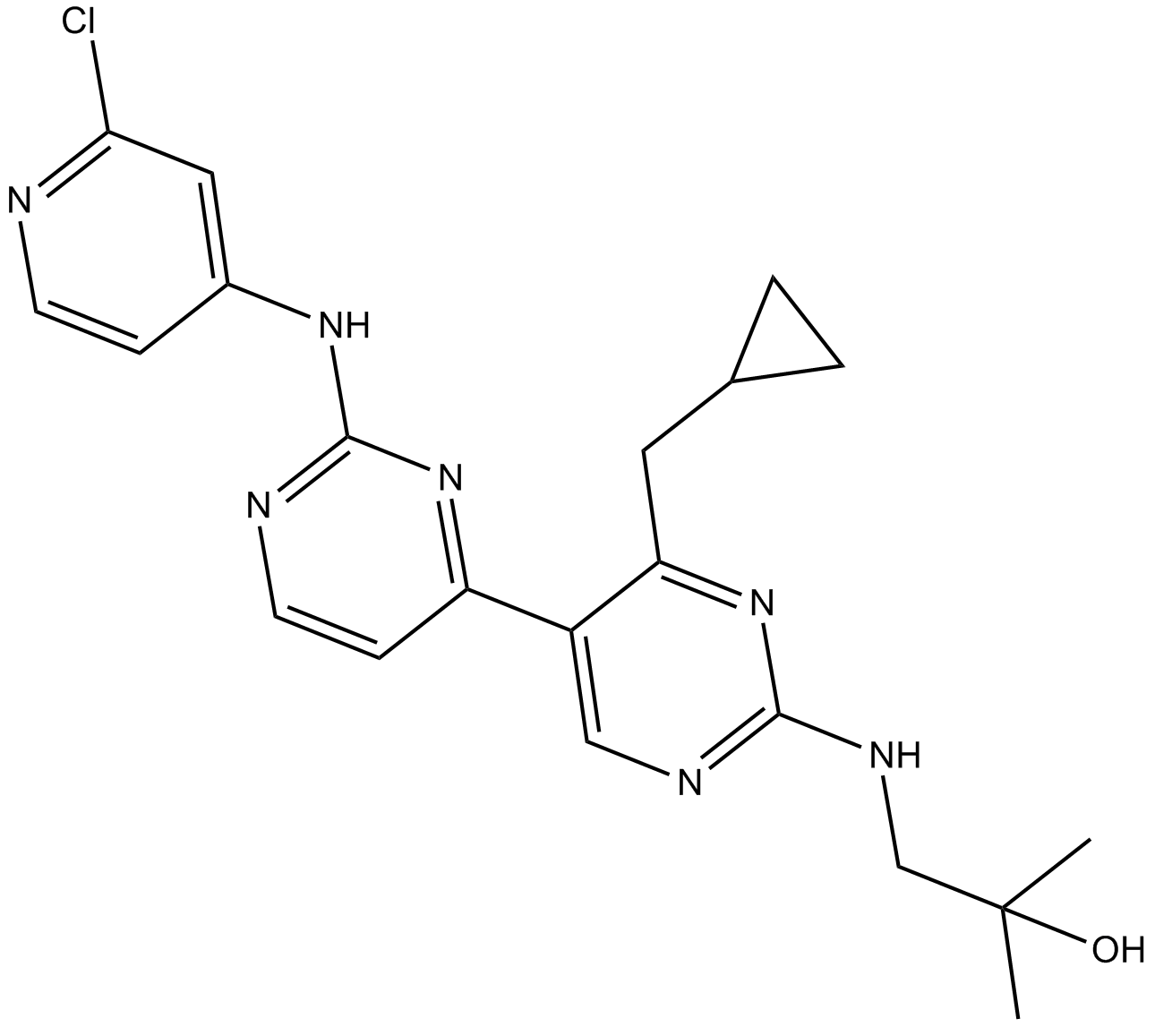 InChI=1S/C21H24ClN7O/c1-21(2,30)12-26-19-25-11-15(17(29-19)9-13-3-4-13)16-6-8-24-20(28-16)27-14-5-7-23-18(22)10-14/h5-8,10-11,13,30H,3-4,9,12H2,1-2H3,(H,25,26,29)(H,23,24,27,28)