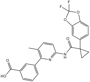 鲁马卡托(Lumacaftor)是一种芳香酰胺,由1-(2,2-二氟-1,3-苯并二氧杂环戊烯-5-基)环丙烷-1-羧酸的羧基与3-(6-氨基-3-甲基吡啶-2-基)苯甲酸的芳香氨基缩合而成。用于治疗囊性纤维化。它是一种CFTR增强剂,也是一种孤儿药。它属于苯甲酸类、吡啶类、芳香酰胺类、环丙烷类、苯并二氧杂环戊烯类和有机氟化合物。鲁马卡托与[DB08820]联合使用,组成固定剂量复方制剂Orkambi,用于治疗6岁及以上患者的囊性纤维化(CF)。囊性纤维化是一种常染色体隐性遗传病,由囊性纤维化跨膜传导调节因子 (CFTR) 基因的多种不同突变引起。CFTR 蛋白是一种跨膜离子通道,参与氯离子和钠离子在肺、胰腺和其他器官细胞膜上的转运。CFTR 基因突变会导致 CFTR 蛋白的生成、错误折叠或功能改变,从而导致细胞膜上的液体和离子转运异常。因此,囊性纤维化患者会产生粘稠的黏液,这些黏液会堵塞产生黏液的器官导管,使患者更容易感染、肺损伤、胰腺功能不全和营养不良。Lumacaftor 通过增强 F508del 突变 CFTR 蛋白的构象稳定性来改善囊性纤维化的症状和潜在的病理机制,防止其错误折叠,并促进成熟蛋白的加工和转运至细胞表面。临床试验结果表明,使用 Orkambi(lumacaftor/ivacaftor)治疗可改善肺功能,降低肺部急性加重风险,增加体重,并改善囊性纤维化症状。然而,这些数据受到了严格审查,临床试验显示,尽管 Orkambi 的年费用高达 25.9 万美元,但疗效却十分有限。肺功能(ppFEV1)的改善具有统计学意义,但幅度很小,仅比基线值提高了 2.6% 至 3.0%,超过 70% 的患者未能达到至少 5% 的绝对改善。多种 CFTR 基因突变与囊性纤维化表型相关,且与疾病严重程度的差异有关。最常见的突变是F508del-CFTR,或称delta-F508 (ΔF508),影响着全球约70%的囊性纤维化(CF)患者。该突变导致第508位氨基酸苯丙氨酸缺失,从而造成CFTR蛋白生成受损,进而显著减少细胞膜上的离子转运蛋白数量。lumacaftor与[DB08820]联合使用,组成固定剂量复方制剂Orkambi,专门用于治疗携带delta-F508突变的CF患者。lumacaftor作为一种蛋白质折叠伴侣,能够帮助维持突变CFTR蛋白的构象稳定性。因此,lumacaftor可以提高CFTR离子通道的生成效率,并增加细胞膜上可用于液体和离子转运的受体总数。第二常见的突变是G551D,影响全球4-5%的囊性纤维化(CF)患者。该突变属于错义突变,细胞表面蛋白质含量充足,但通道的开放和关闭机制发生改变。对于携带G551D和其他罕见错义突变的患者,通常使用[DB08820](Kalydeco)进行治疗,因为它能增强CFTR蛋白的通道开放概率,从而改善异常的门控机制。在lumacaftor和[DB08820](Kalydeco)问世之前,CF的治疗主要集中于控制感染、营养支持、清除黏液和缓解症状,而非改善疾病本身。Orkambi于2015年7月获得美国食品药品监督管理局(FDA)批准,并于2016年1月获得加拿大卫生部批准,是首个获批用于治疗携带delta-F508突变的囊性纤维化的复方制剂。伊伐卡托由Vertex Pharmaceuticals公司生产和销售。