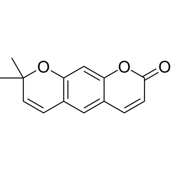 据报道,黄原素存在于当归(Angelica gigas)、榕树(Ficus erecta var. beecheyana)以及其他有相关数据的生物体中。 1.黄原素是一种香豆素化合物。在文献[1]中,研究人员使用高速逆流色谱法(HSCCC)从植物巴豆(Croton cajucara Benth.)中分离得到黄原素,分离后的纯度超过98%。分离过程采用正己烷-乙酸乙酯-甲醇-水(4:3:4:3,v/v/v/v)的双相溶剂体系[1]。 2.共生真菌白环柄菇(Leucoagaricus gongylophorus)对切叶蚁的生存至关重要,因为切叶蚁依赖这种真菌将植物材料分解成营养物质。黄酮苷对该真菌的抑制作用表明其具有作为生物防治剂防治切叶蚁(一种农业害虫)的潜力[1][2] 3. 在[2]中,黄酮苷与其他香豆素类化合物(例如伞形酮、东莨菪素)在抑制白环柄菇(Leucoagaricus gongylophorus)方面进行了比较。结果表明,黄酮苷的抗真菌活性高于伞形酮(IC₅₀:120 μg/mL),但与东莨菪素(IC₅₀:45 μg/mL)活性相似[2] |