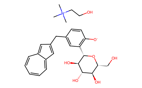 C[N+](C)(C)CCO.C1=CC=C2C=C(C=C2C=C1)CC3=CC(=C(C=C3)[O-])[C@H]4[C@@H]([C@H]([C@@H]([C@H](O4)CO)O)O)O